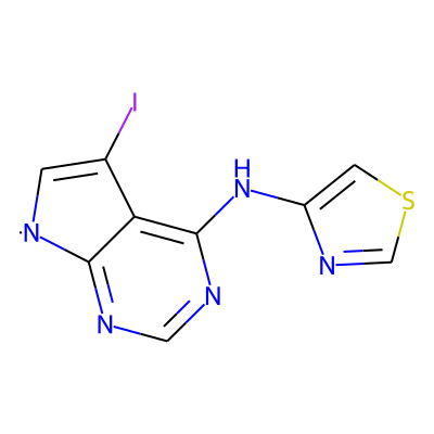 IC1=C[N]c2ncnc(Nc3cscn3)c21| HBA: | 5 | RingCount: | 3 |