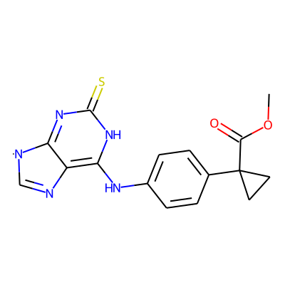 COC(=O)C1(c2ccc(Nc3[nH]c(=S)nc4c3N=C[N]4)cc2)CC1| HBA: | 7 | RingCount: | 4 |