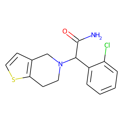 NC(=O)C(c1ccccc1Cl)N1CCc2sccc2C1| HBA: | 3 | RingCount: | 3 |