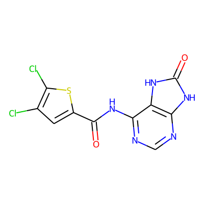 O=C(Nc1ncnc2[nH]c(=O)[nH]c12)c1cc(Cl)c(Cl)s1| HBA: | 7 | RingCount: | 3 |