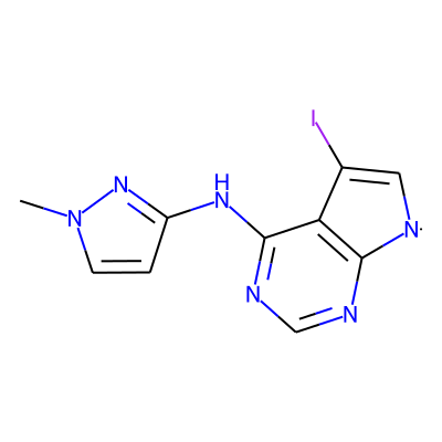 Cn1ccc(Nc2ncnc3c2C(I)=C[N]3)n1| HBA: | 6 | RingCount: | 3 |
