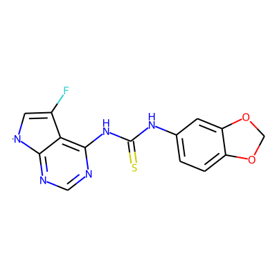 FC1=C[N]c2ncnc(NC(=S)Nc3ccc4c(c3)OCO4)c21| HBA: | 7 | RingCount: | 4 |
