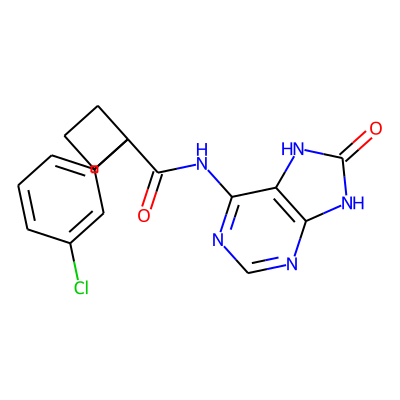 O=C(Nc1ncnc2[nH]c(=O)[nH]c12)C1(c2cccc(Cl)c2)CCC1| HBA: | 7 | RingCount: | 4 |