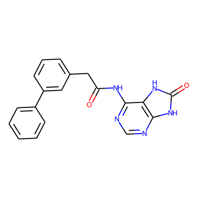 O=C(Cc1cccc(-c2ccccc2)c1)Nc1ncnc2[nH]c(=O)[nH]c12| HBA: | 7 | RingCount: | 4 |