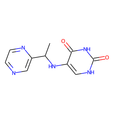 CC(Nc1c[nH]c(=O)[nH]c1=O)c1cnccn1| HBA: | 7 | RingCount: | 2 |