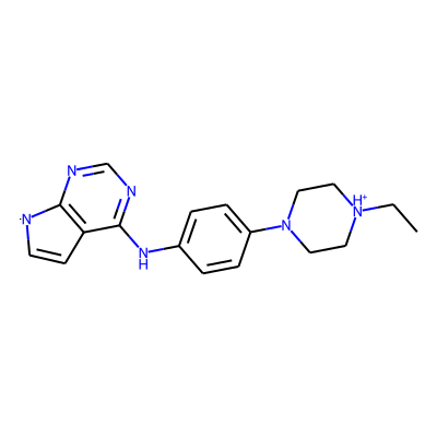 CC[NH+]1CCN(c2ccc(Nc3ncnc4c3C=C[N]4)cc2)CC1| HBA: | 6 | RingCount: | 4 |
