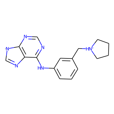C1=Nc2c(ncnc2Nc2cccc(C[NH+]3CCCC3)c2)[N]1| HBA: | 6 | RingCount: | 4 |