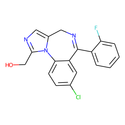 OCc1ncc2n1-c1ccc(Cl)cc1C(c1ccccc1F)=NC2| HBA: | 4 | RingCount: | 4 |