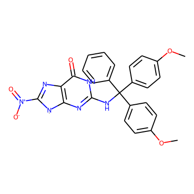 COc1ccc(C(Nc2nc3c(c(=O)[nH]2)N=C([N+](=O)[O-])[N]3)(c2ccccc2)c2ccc(OC)cc2)cc1| HBA: | 11 | RingCount: | 5 |