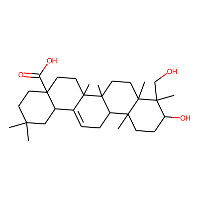 CC1(C)CCC2(C(=O)O)CCC3(C)C(=CCC4C3(C)CCC3(C)C(C)(CO)C(O)CCC43C)C2C1| HBA: | 4 | RingCount: | 5 |