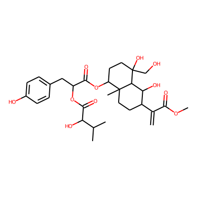 C=C(C(=O)OC)C1CCC2(C)C(OC(=O)C(Cc3ccc(O)cc3)OC(=O)C(O)C(C)C)CCC(O)(CO)C2C1O| HBA: | 11 | RingCount: | 3 |