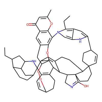 CCc1c2cc3[nH]c2cn1-c1c2c(cc4c(=O)cc(C)oc14)CC1OOC4C=CC5=C(CC4)C4C6C(=CC(C57NC5CC(CC)C8CCC7CC58)C14O2)CCC1C2(C=CC3CC2)CCCC12C(O)=NCC62| HBA: | 10 | RingCount: | 20 |