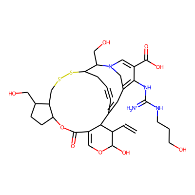 C=CC1C(O)OC=C2C(=O)OC3CCC(CO)C3CSSC3CC#CC(=CC4=C(NC(=[NH2+])NCCCO)C(C(=O)O)=CN(C4)C3CO)C21| HBA: | 13 | RingCount: | 5 |
