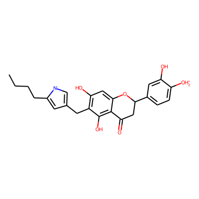 CCCCc1cc(Cc2c(O)cc3c(c2O)C(=O)CC(c2ccc([OH2+])c(O)c2)O3)c[n-]1Sugarmoiety: