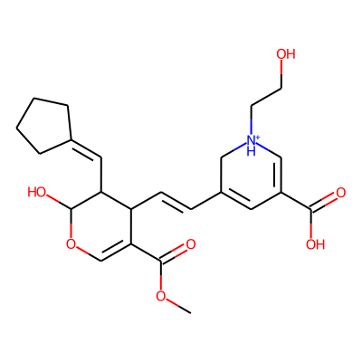 COC(=O)C1=COC(O)C(C=C2CCCC2)C1C=CC1=CC(C(=O)O)=C[NH+](CCO)C1| HBA: | 8 | RingCount: | 3 |