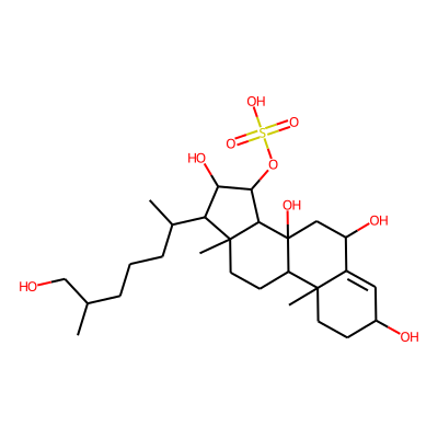 CC(CO)CCCC(C)C1C(O)C(OS(=O)(=O)O)C2C1(C)CCC1C3(C)CCC(O)C=C3C(O)CC12O| HBA: | 9 | RingCount: | 4 |